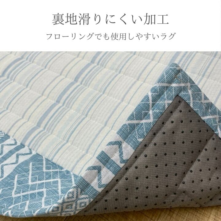 表地綿100%。中心部分のしじらはシャキッとさわやか。さらっとしていて夏に最適。凹凸感があり肌離れ◎。額部分は北欧テーストを採用し明るい雰囲気を出した商品です。柄に垂直にキルトを入れるこだわりの製法を採用して見た目にもすっきりとした商品に仕上げています。裏素材は強度のあるポリエステル不織布を採用。すべりにくい加工をしているのでフローリングでも使用しやすい商品です。約1.5畳サイズでソファー前やベッド横などに最適。敷きパッドとしても使用できるサイズです。