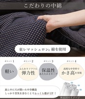 中綿に東レマッシュロン綿を使用、とても軽量な上に、ふんわりと弾力性に富んでいます。国内の生産者が丁寧に綿入れ加工をしています。