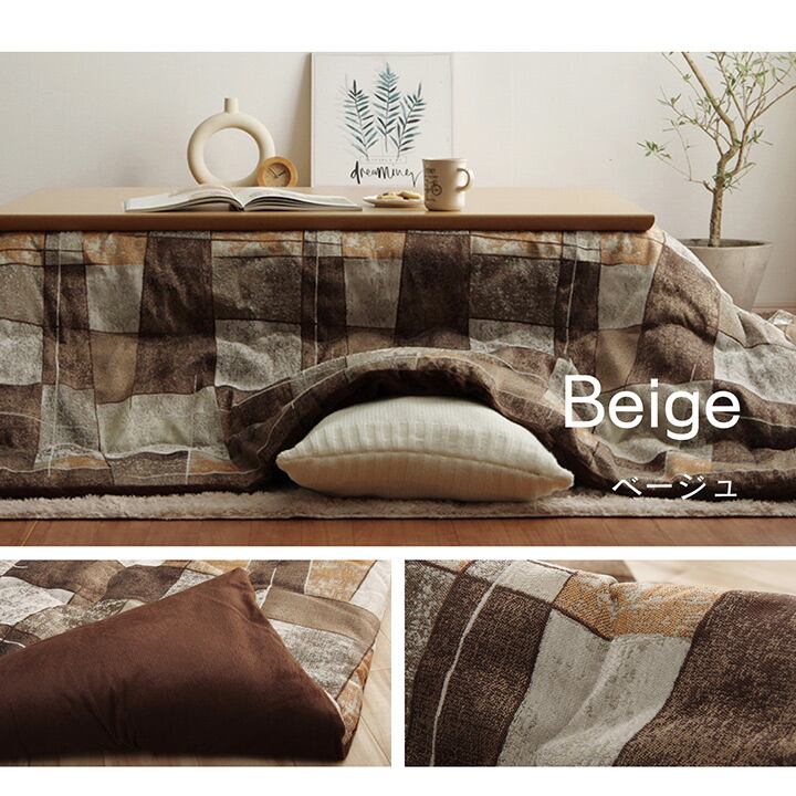 ビンテージ風のパッチワークデザインが特徴のしっかりした生地を使ったこたつ布団。表地はシェニール織りの暖かみある凹凸感ある生地を使用し、裏地にはなめらかな肌触りの短毛マイクロ生地を使用しています。たっぷり入った東レマッシュロン綿がふかふかとした弾力性と保温性を高め、「軽くて暖かい」を実現しました。ふっくらとしたボリューム感は国内で綿入加工をしている商品だからできる仕上がり。1枚1枚丁寧に仕上げた安心の品質です。