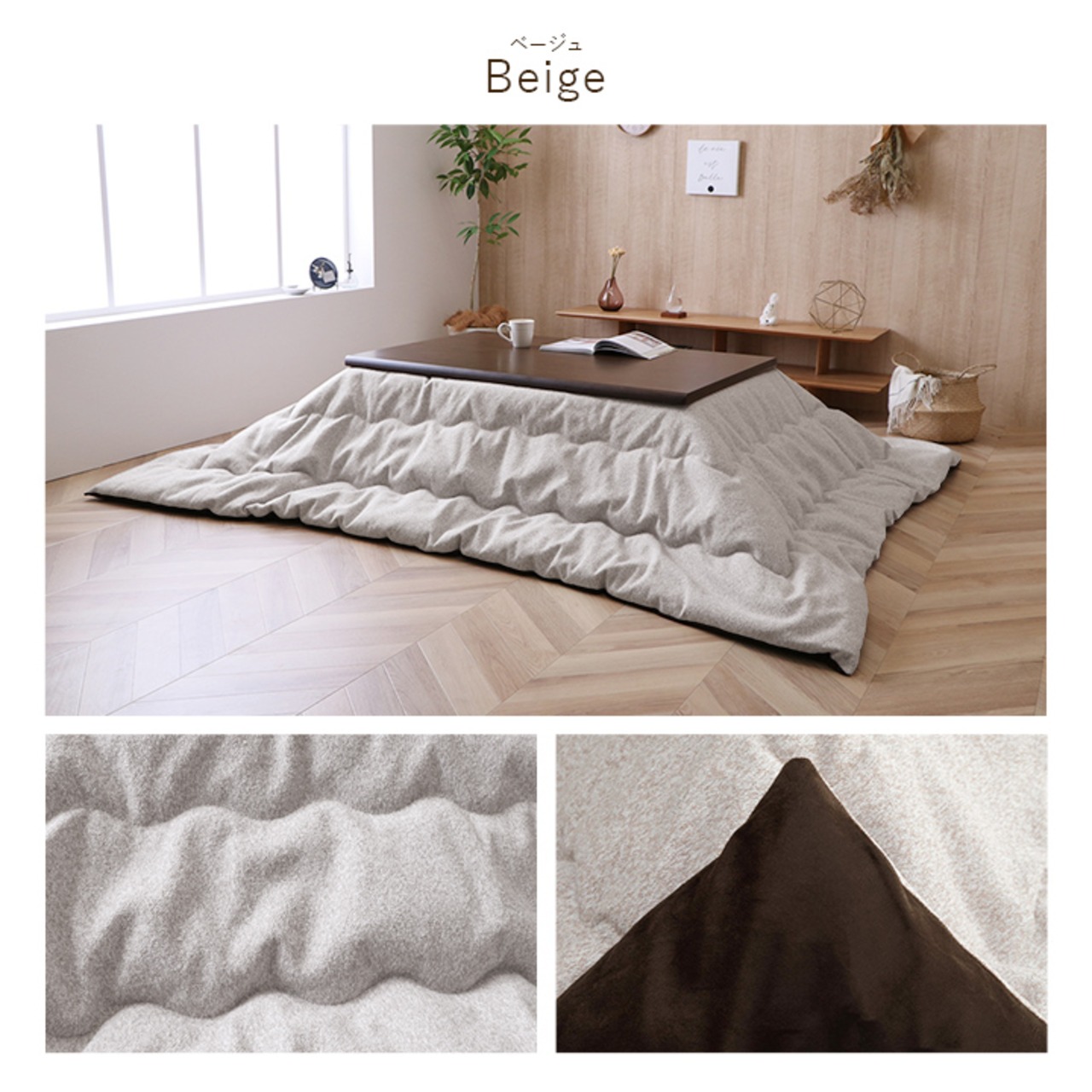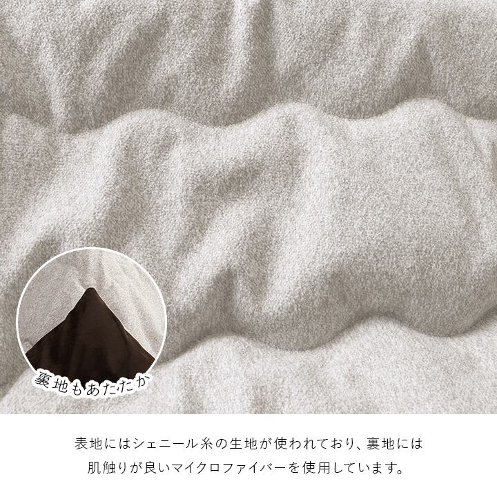 どんな雰囲気にも合わせやすい上質なシェニール糸を使用したシンプルな無地調のこたつ布団です。表地にはシェニール糸の生地が使われており、裏地には肌触りが良いマイクロファイバーを使用しています。中綿には弾力性と保温性の高い東レマッシュロン綿を使用しているため軽くて暖かいです。部分暖房のこたつは電気代もおトクです。