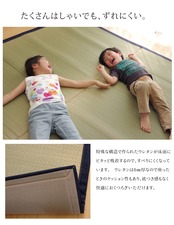 無染土と呼ばれる泥染加工をしていないい草を使用した商品です。無染土のい草はほこりも出にくく、しなやかでい草本来のすべすべとした肌触りの商品です。ヘリには同じ自然素材の綿を使用しており、自然の良さを実感して頂けます。国産(九州産)のい草を使用しており、一本一本が太く、表皮が厚く繊維がキメ細かいので弾力性があり、耐久性に優れています。い草には空気の自然浄化作用、湿度の調節作用などがあります。また汚れにくく、使用するうちに黄金色に変化し味が出ます。