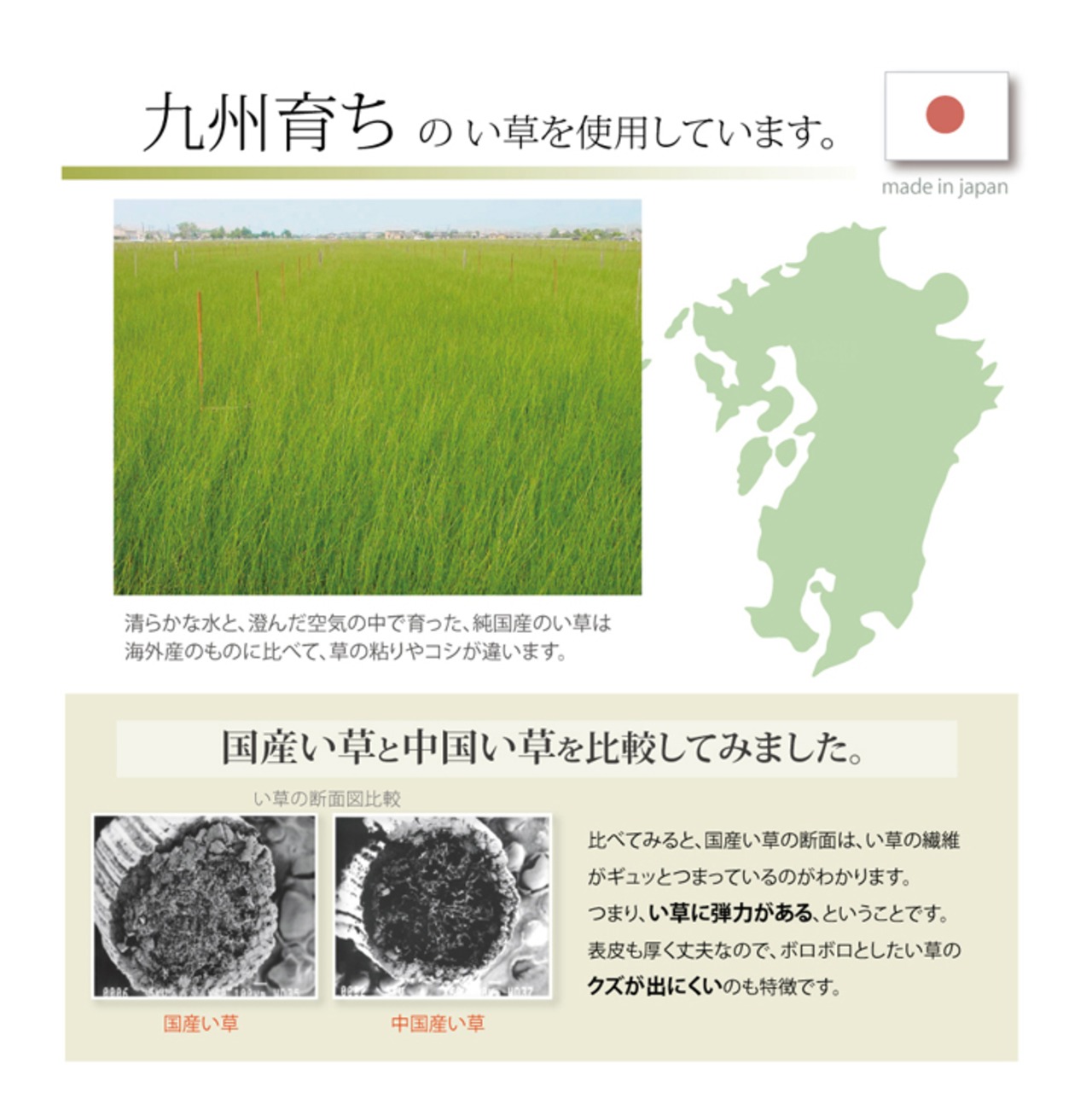 無染土と呼ばれる泥染加工をしていないい草を使用した商品です。無染土のい草はほこりも出にくく、しなやかでい草本来のすべすべとした肌触りの商品です。ヘリには同じ自然素材の麻を使用しており、自然の良さを実感して頂けます。国産(九州産)のい草を使用しており、一本一本が太く、表皮が厚く繊維がキメ細かいので弾力性があり、耐久性に優れています。い草には空気の自然浄化作用、湿度の調節作用などがあります。また汚れにくく、使用するうちに黄金色に変化し味が出ます。
