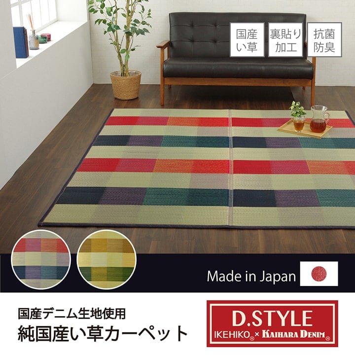 広島県のデニム生地メーカーとコラボした商品です。デニムの生地をヘリに使用しました。カラフルない草とデニムは相性ばっちりです。お部屋の雰囲気をがらりと変えてくれる商品です。国産(九州産)のい草を使用しています。一本一本が太く、表皮が厚く繊維がキメ細かいので弾力性があり、耐久性に優れています。い草には空気の自然浄化作用、湿度の調節作用などがあります。裏には国産のウレタンを使用しほどよいクッション性を持たせました。い草に青森ヒバ加工を施しています。(抗菌、防臭効果)