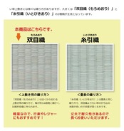 上敷きを敷くだけで畳のお部屋をリフレッシュ出来ます。日焼けしてしまった畳のリフレッシュに、新品の畳を汚さないためのカバーにご使用下さい。長さ105〜110cmの国産(九州産)い草を使用しています。そのうち約95cmを使用しています。ヘリ際は強く白みを帯びます(日焼けではありません、い草の根元と先端部分の色です。)が、安価でお求めやすい商品です。い草は長いものほど高級になります。い草は先端部分が赤茶色く、根元が白く真中が青(緑)色です。真中の良質な青の部分を多く使用するほど、丈夫で綺麗な仕上がりとなります。またイ草は使用するうちに日焼けをしますが、真中の青の部分を多く使用したものほど、全体が綺麗にムラなく日焼けし、味が出ます。国産(九州産)のい草を使用しています。国産い草は一本一本が太く、表皮が厚く繊維がキメ細かいので弾力性があり、耐久性に優れています。い草には空気の清浄化作用、湿度の調節作用があり、汚れにくいといった特徴があります。い草に青森ヒバ加工を施しています。(抗菌、防臭効果)表裏の両面が使えて経済的です。