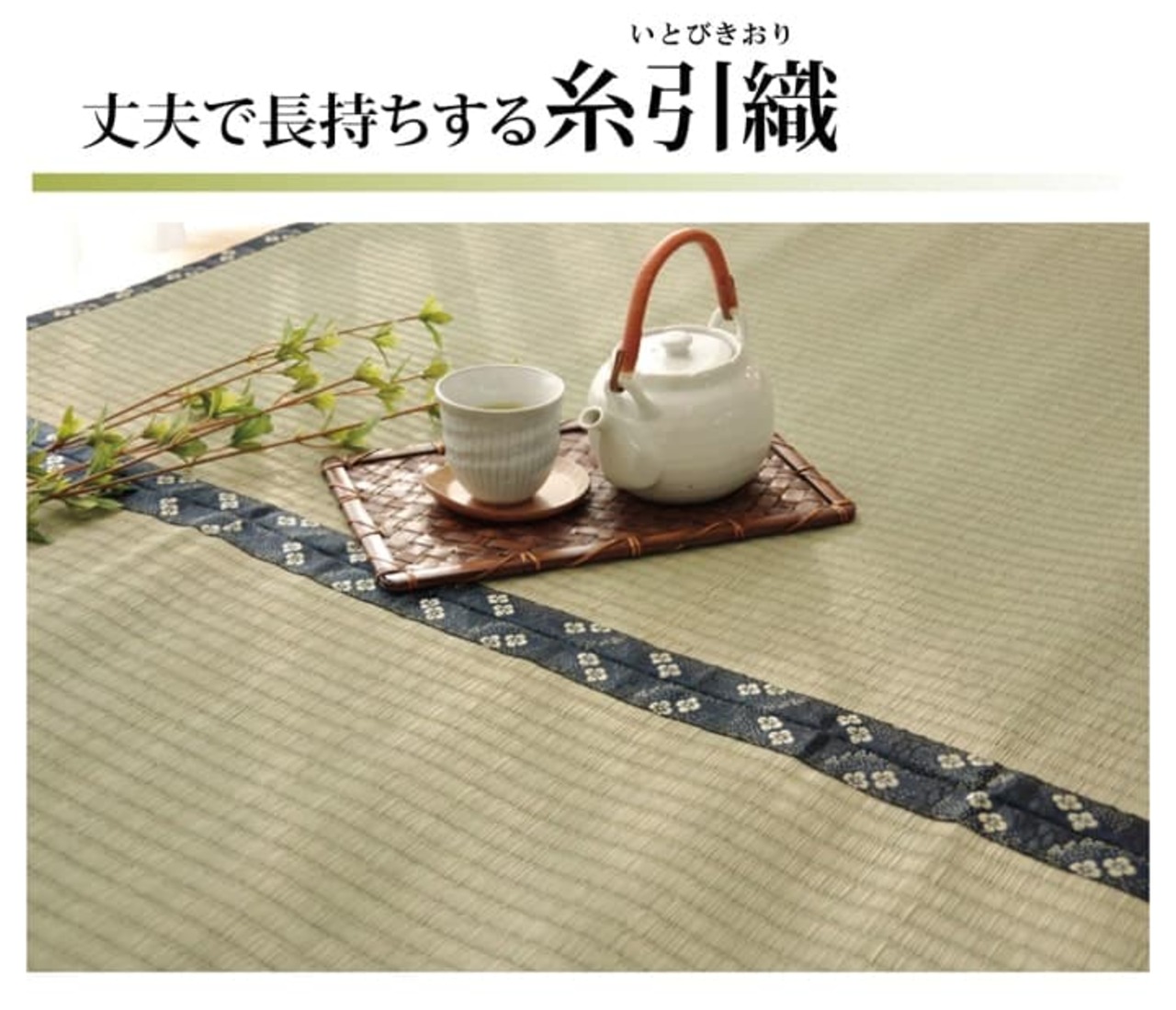 上敷きを敷くだけで畳のお部屋をリフレッシュ出来ます。日焼けしてしまった畳のリフレッシュに、新品の畳を汚さないためのカバーにご使用下さい。長さ120cm以上の長い国産(九州産)い草を使用しています。そのうち約92cmを使用しています。ヘリ際の白い部分が少ない、長いイ草を使用した高級な商品です。(白い部分は日焼けではありません、い草の根元と先端部分の色です。)い草は長いものほど高級になります。い草は先端部分が赤茶色く、根元が白く真中が青(緑)色です。真中の良質な青の部分を多く使用するほど、丈夫で綺麗な仕上がりとなります。またイ草は使用するうちに日焼けをしますが、真中の青の部分を多く使用したものほど、全体が綺麗にムラなく日焼けし、味が出ます。こちらの商品は畳表と同じ織り方の糸引織で仕上げました。双目織りと比べて、い草の打ち込み本数が多いため丈夫です。表面が滑らかなので、ホコリなどがたまりにくいのが特徴です。長くご使用されたい方や、耐久性をお求めの方には糸引織をおすすめします。国産(九州産)のい草を使用しています。国産い草は一本一本が太く、表皮が厚く繊維がキメ細かいので弾力性があり、耐久性に優れています。い草には空気の清浄化作用、湿度の調節作用があり、汚れにくいといった特徴があります。い草に青森ヒバ加工を施しています。(抗菌、防臭効果)表裏の両面が使えて経済的です。