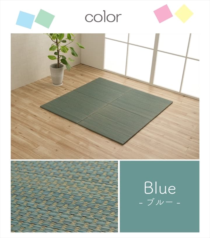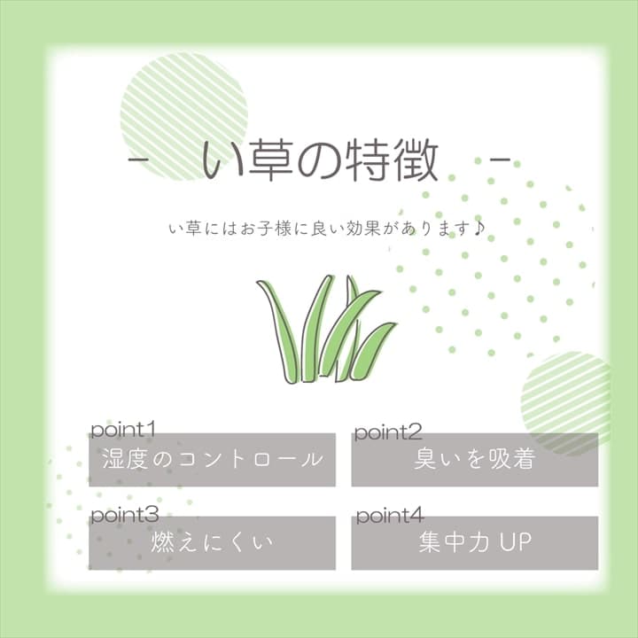 床に置くだけで簡単に遊べる空間ができるい草の置き畳です。中材には10mmのフェルトを使用しました。裏は滑り止めドットで滑りにくいです。い草には空気の自然浄化作用、湿度の調節作用などがあります。集中力がUPするといわれているため、キッズスペースに最適です。コンパクトで軽量タイプなので、持ち運び、設置、片づけなども簡単にできます。カラーバリエーションは4色で、いろいろな組み合わせができます。
