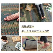 縦糸が多い為、細かく繊細で浮き上がって見えるのが特徴です。裏は滑り止め不織布付きで、滑る心配がありません。い草には空気の自然浄化作用、湿度の調節作用などがあります。い草にヒバエッセンス加工を施しています(抗菌防臭効果)。青森県のヒバの木から抽出した「ヒバ油」をメーカー独自の技術で商品に加工しました。「ヒバ油」には、ヒノキチオールという天然物質としては極めて抗菌性の高い成分が含まれ、医療や食品など多分野で利用研究が進められています。
