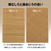インドネシア原産の5年〜7年育成された籐(ロンティ)を使用しているあじろ商品です。夏を快適に過ごす素材として長年重宝されています。6畳編むのに3週間かかる手の込んだあじろ織り独自の編み模様が高級感と涼感をかもしだすます。冷たくしなやかでとても肌触りがよく、籐だけで編んでいますのでとても長く10年以上使用できる逸品です。使い込むほどに綺麗な飴色に変化していきます。